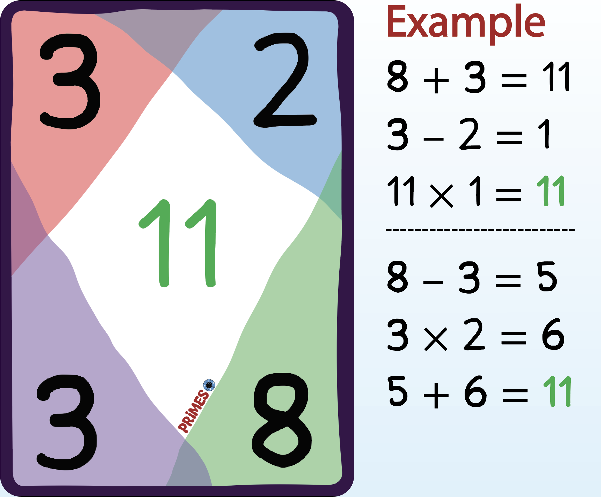 Make the prime number displayed in the center of any card using the four numbers displayed in the corners. You must use all four numbers exactly once and the basic four operations (addition, subtraction, multiplication, and division) any number of times to reach the center number. Play solo or with friends. We have designed the game with three levels to meet you at your math level.